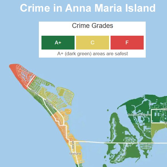 - Anna Maria Island, Florida, is generally considered a safe, tourist-friendly destination with low violent crime rates. The majority of reported incidents are "crimes of opportunity," such as theft from unlocked cars or beach rentals, making it important for visitors to secure their belongings. Violent crimes are rare, though burglaries and larceny occur, especially with high tourism.