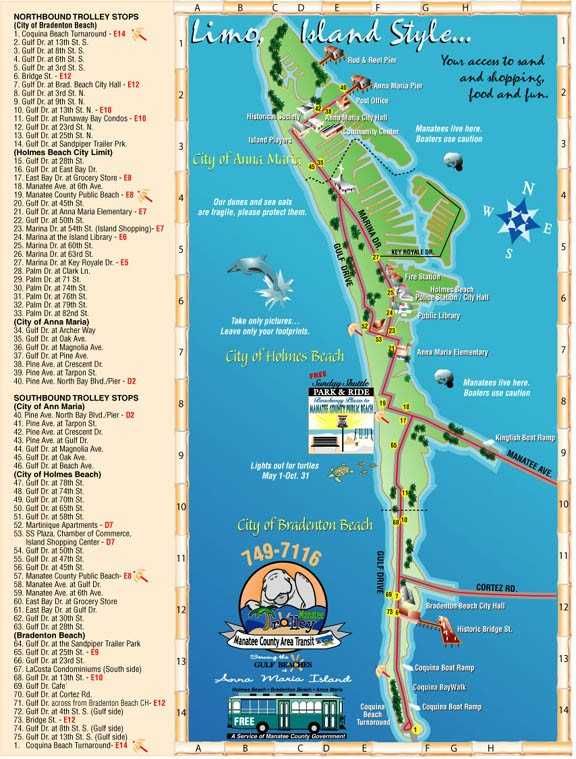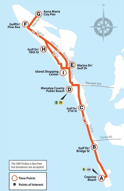 The Anna Maria Island Trolley is a free service running the length of the 7-mile barrier island from Coquina Beach (south) to Anna Maria City Pier (north). Operating daily from 6:00 a.m. to 9:00 p.m. at 20-minute intervals, it connects key areas including Bradenton Beach, Holmes Beach, and Pine Avenue, with major stops at Publix and Manatee Beach.